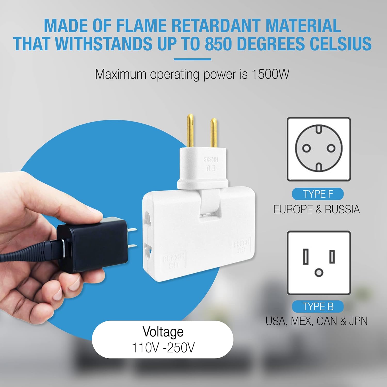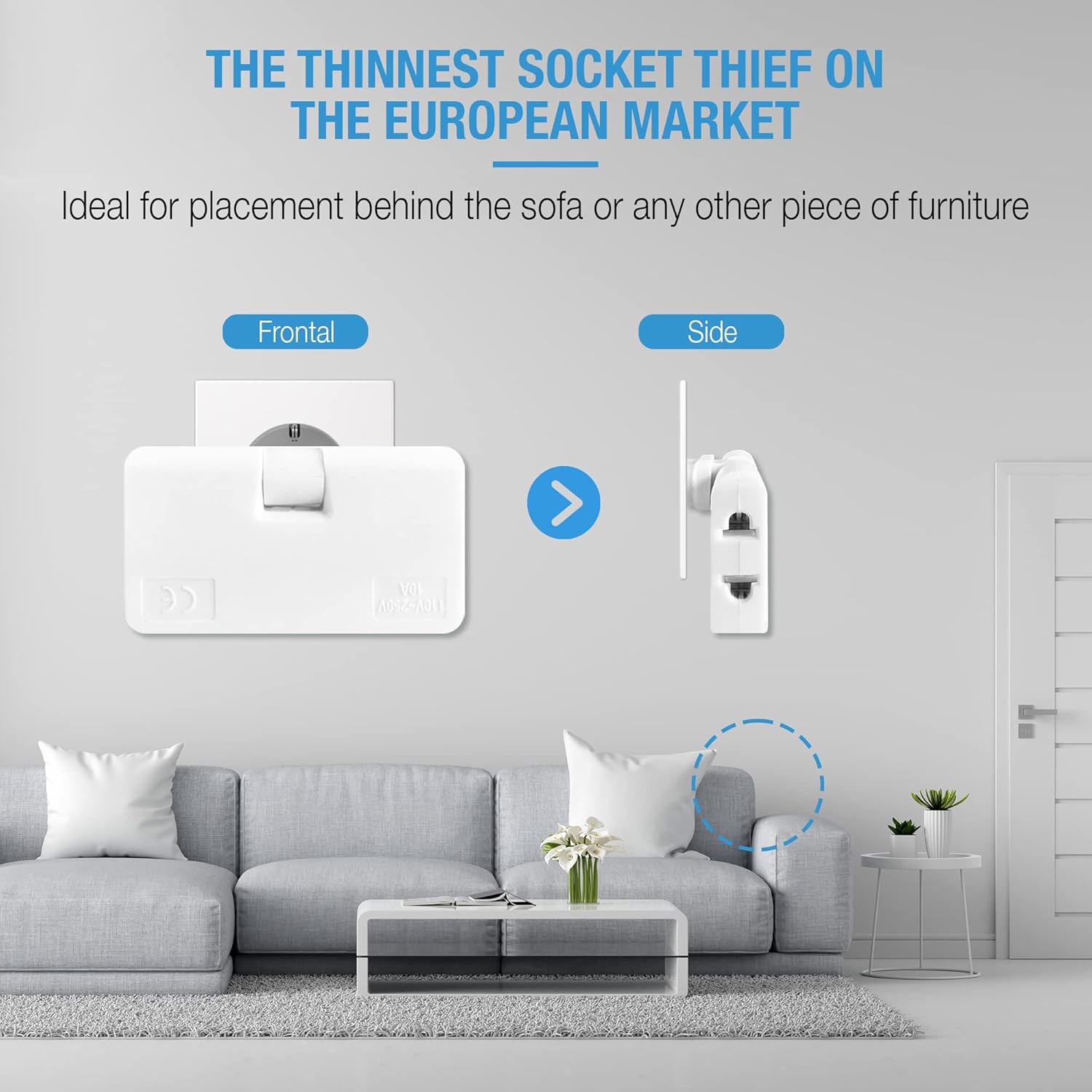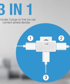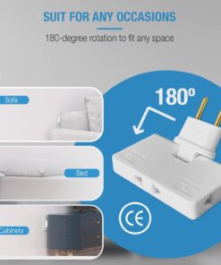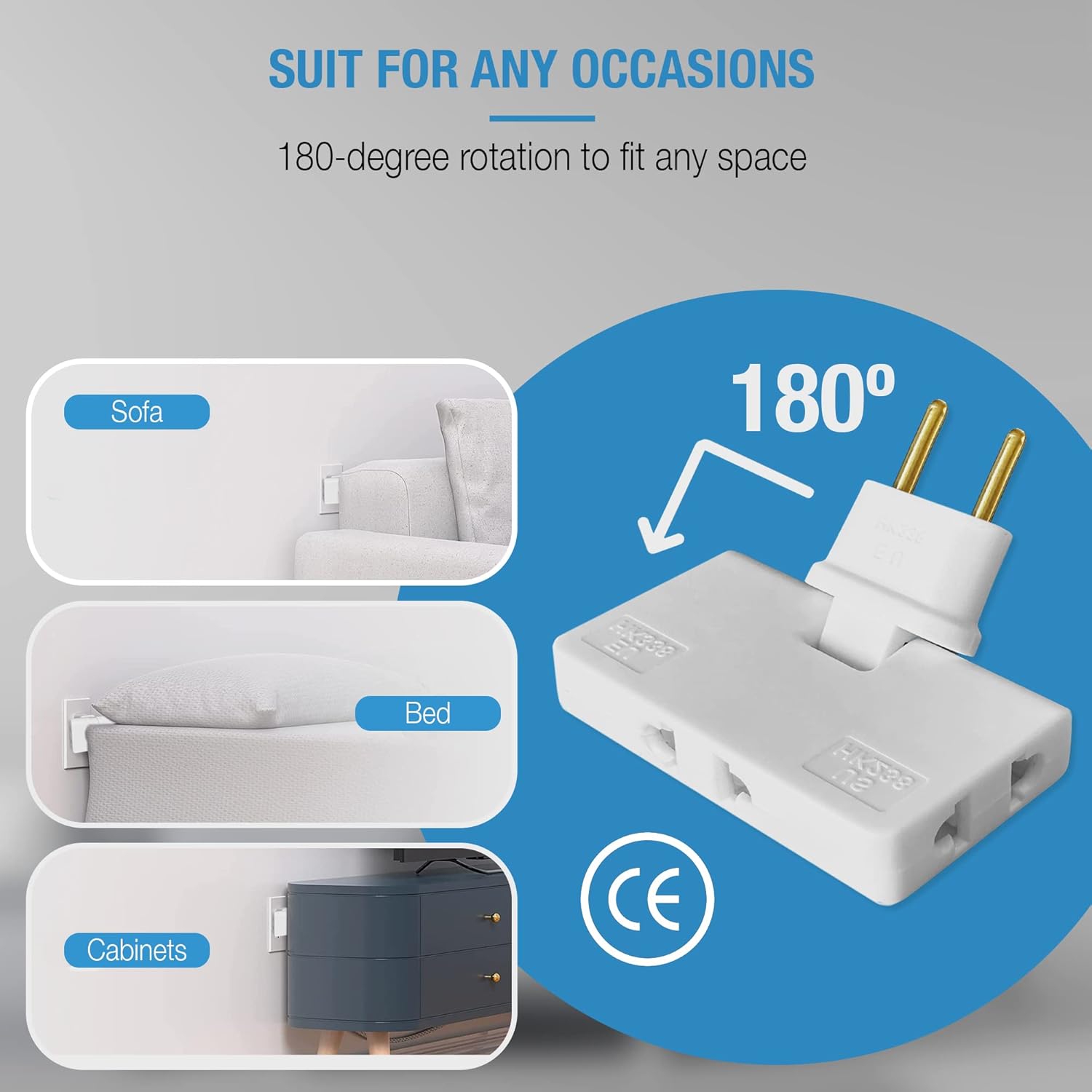 Este enchufe plano cuenta con 3 tomas adaptadas a conectores europeos y americanos. Es perfecto para conectar varios dispositivos electrónicos al mismo tiempo, evitando problemas al conectar todos los dispositivos a la vez. Al girar 180º ocupa muy poco espacio por lo que es ideal para colocar en espacios difíciles, detrás de sofás, cortinas, etc